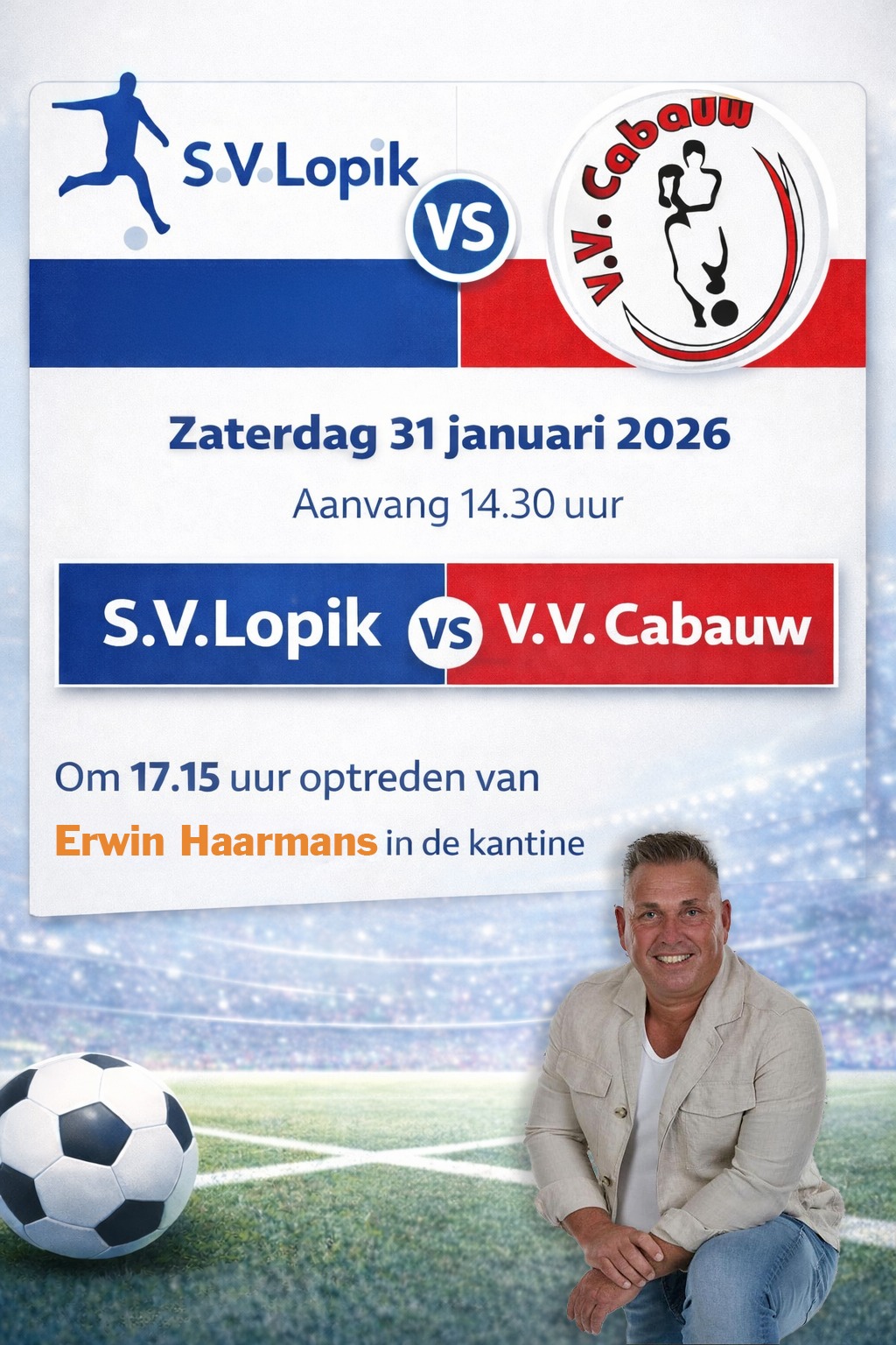 Ook naast het veld is er van alles te beleven. Voor aanvang van de wedstrijd kun je bij de ingang van het sportpark terecht voor een warme kom erwtensoep. Na het laatste fluitsignaal gaat het feest gewoon door. Om 17:15 uur treedt Erwin Haarmans op in de kantine.