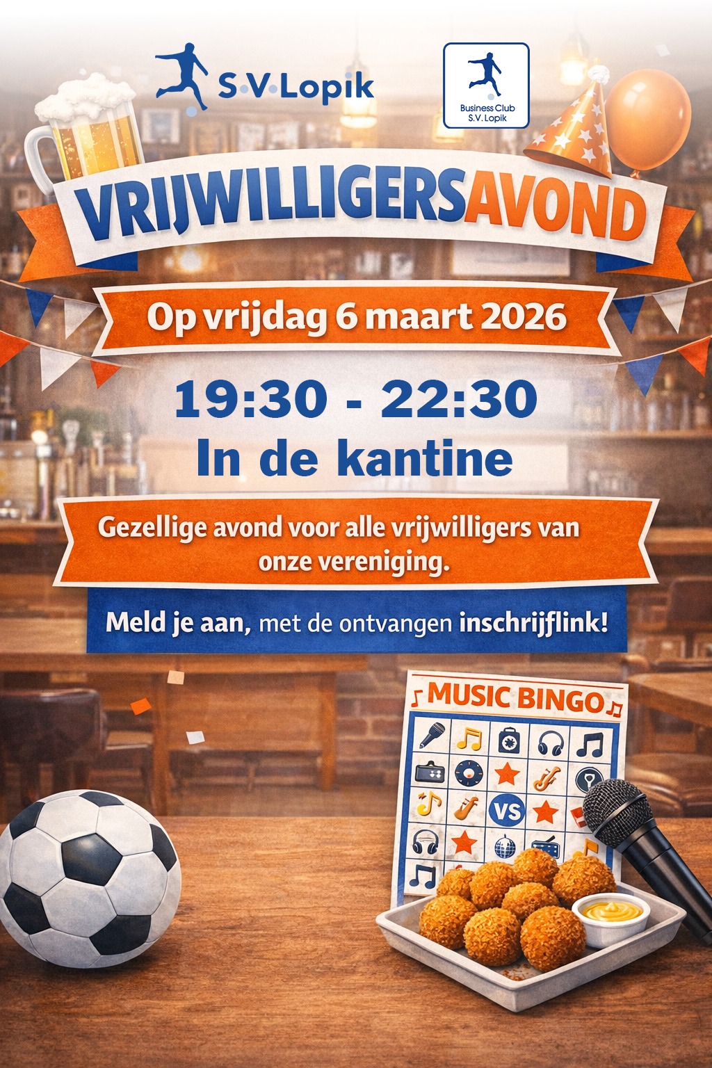 Op vrijdag 6 maart zijn alle vrijwilligers van harte welkom in de kantine. We starten om 19.30 uur met koffie en thee, uiteraard met iets lekkers erbij. Rond 20.30 uur staat er een leuk en onderhoudend intermezzo op het programma: de enige echte S.V. Lopik (NL) Muziek Bingo. Daarnaast zorgen we de hele avond voor een drankje en een snack. De avond duurt tot ongeveer 22.30 uur.